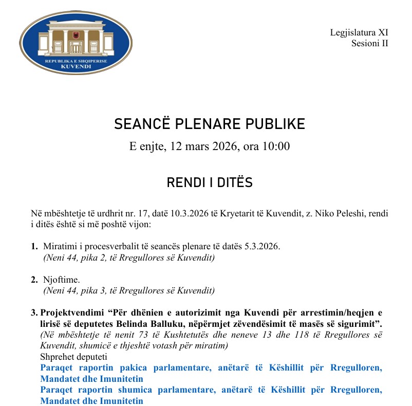 Sipas dokumentit zyrtar të publikuar nga Kuvendi, seanca do të zhvillohet në bazë të urdhrit nr. 17, datë 10 mars 2026, të kryetarit të Kuvendit, Niko Peleshi.
