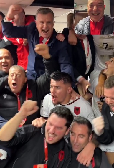 Blendi Fevziu poston festën nga dhoma e zhveshjes së djemve kuqezi pas fitores. Shohim kreun e FSHF dhe deputetin e PS, Taulant Balla një tifoz i zjarrtë dhe mbështetës i madh i kombëtares, teksa festojnë fitoren historike.