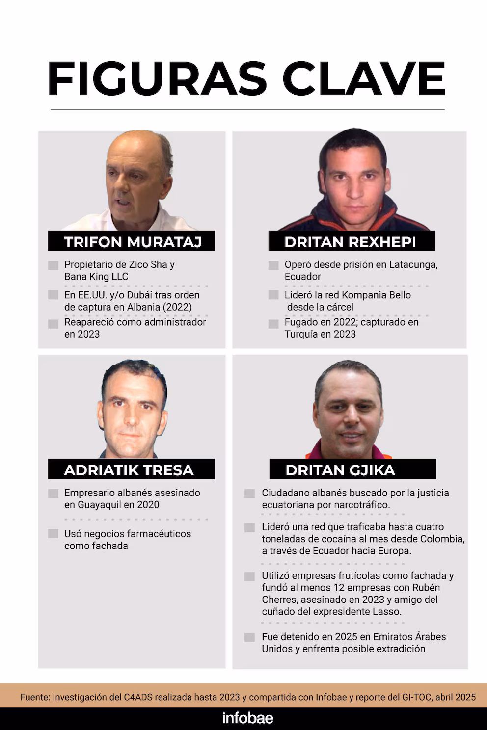 - Dritan Gjika, një tjetër bos shqiptar, drejtonte një rrjet që trafikonte deri në 4 ton kokainë çdo muaj nga Kolumbia, përmes Ekuadorit, drejt Europës. Ai përdorte mbi 12 kompani të regjistruara, duke përfshirë sektorët e ndërtimit dhe eksportit të frutave. Gjika u arrestua në Emiratet e Bashkuara Arabe në vitin 2025 dhe përballet me ekstradim.