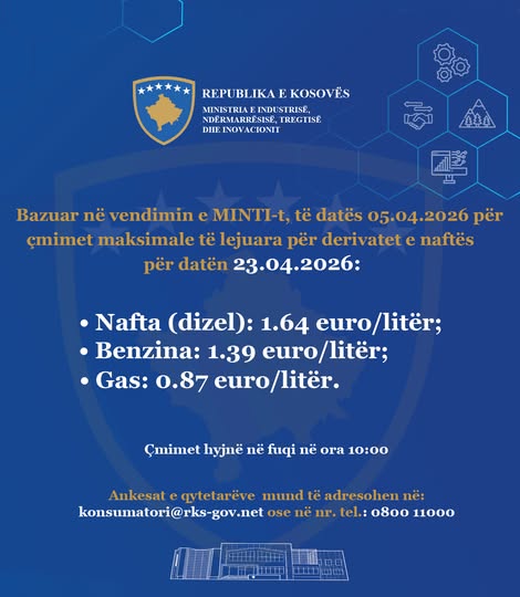 Ministria e Industrisë, Ndërmarrësisë dhe Tregtisë ka bërë të ditur se këto janë çmimet maksimale të lejuara për datën 23 prill 2026, të cilat duhet të respektohen nga operatorët në treg.