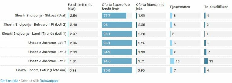 Nga ana tjetër, të dhënat e BIRN dëshmojnë se kjo nuk është një anomali e vitit 2021, por pjesë e një modeli që shfaqet përgjatë shumë vitesh. Analiza e 21 nga 23 tenderave për Unazën e Madhe të Tiranës, ku mes viteve 2011–2024 u dhanë 45.9 miliard lekë, tregon se dhjetë procedura u fituan me më shumë se 98% të fondit limit, pjesa tjetër me mbi 94%; ndërsa vetëm në dy tendera kompanitë në garë dhanë oferta që i kursyen buxhetit mbi 20% të fondit.
