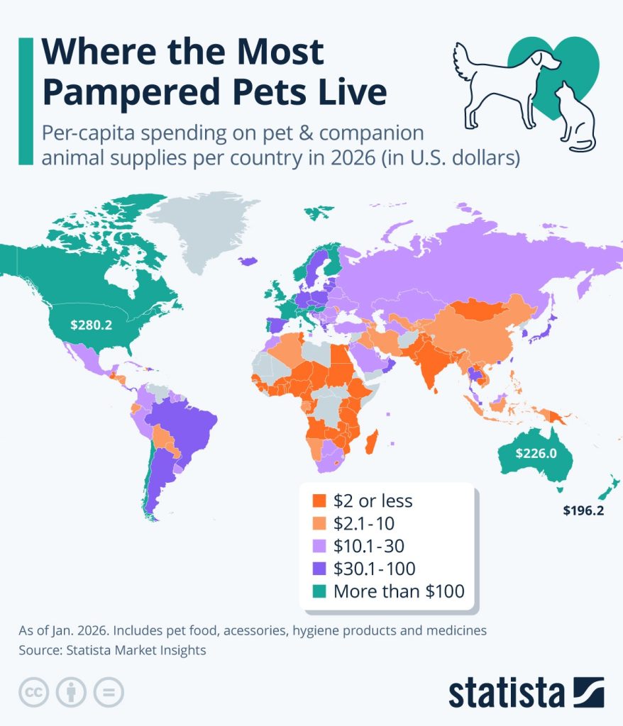 Shtetet e Bashkuara kryesojnë botën për shpenzimet për kafshët shtëpiake, me rreth 280 dollarë për frymë në vit, sipas të dhënave të publikuara nga Statista Market Insights. Pas SHBA-ve renditen Australia me 226 dollarë dhe Zelanda e Re me 196 dollarë për frymë.