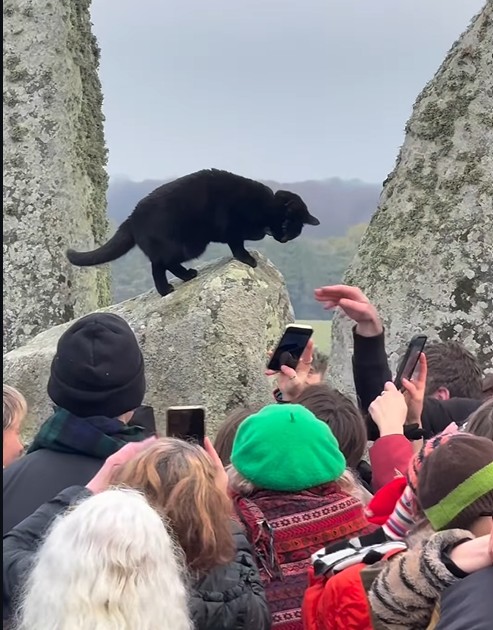 Në një video që u bë virale, një mace e zezë e adhurueshme, me qafore, u pa e ulur mbi një nga gurët e mëdhenj të Stonehenge, duke vëzhguar turmat teksa festonin ditën më të shkurtër të vitit dhe sipas Daily Mail ky është një ogur i mirë.